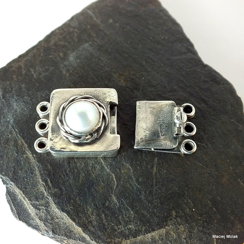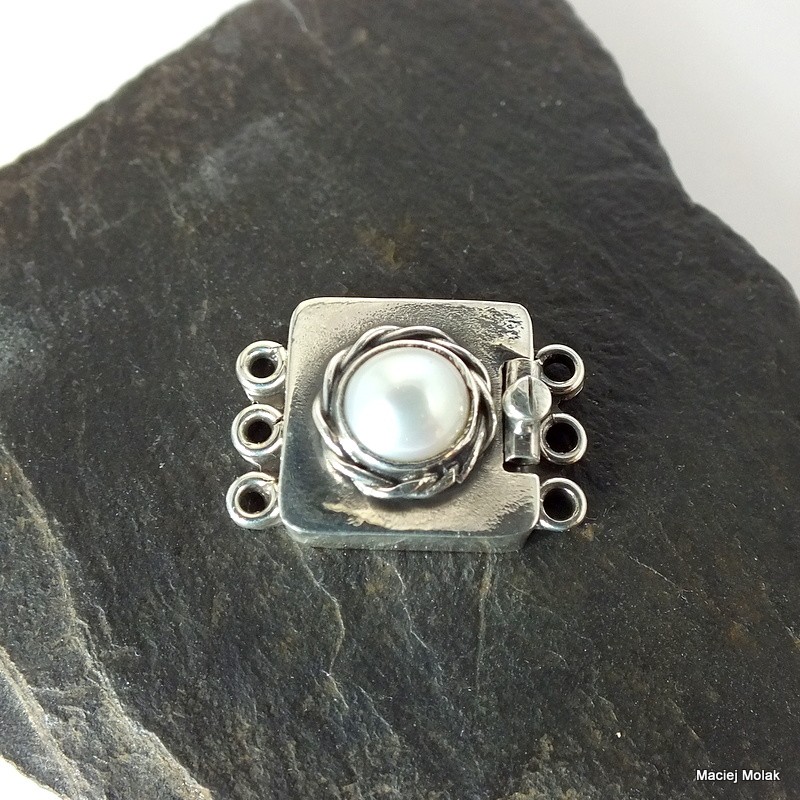 Ręcznie robione zapięcie do bransoletki lub naszyjnika. Ozdobione białą perłą hodowaną.