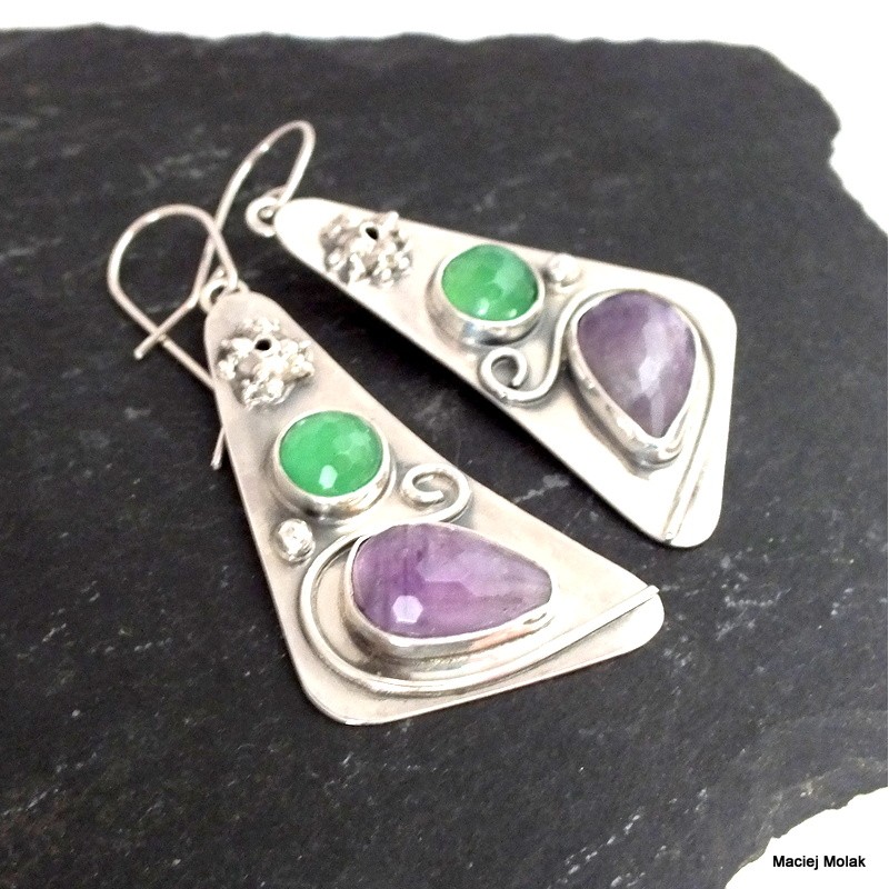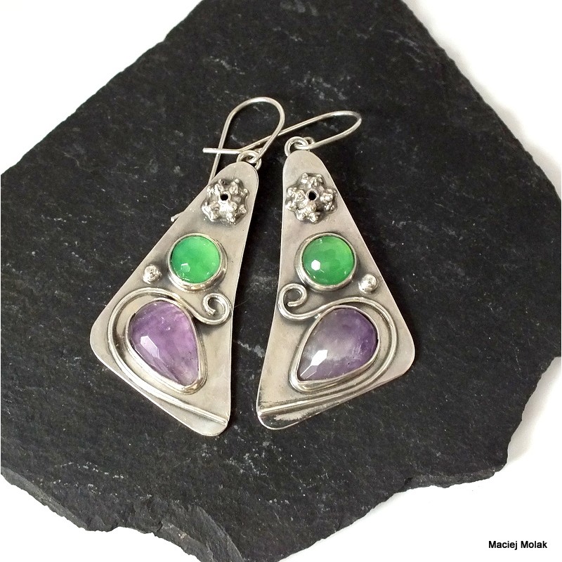 Kolczyki wiszące z fasetowanymi ametystami i fasetowanym zielonym agatem.