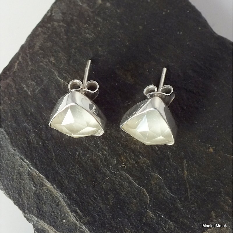 Nieduże kolczyki na sztyfcie z fasetowanym kryształem górskim. Takie niezobowiązujące trójkąciki.