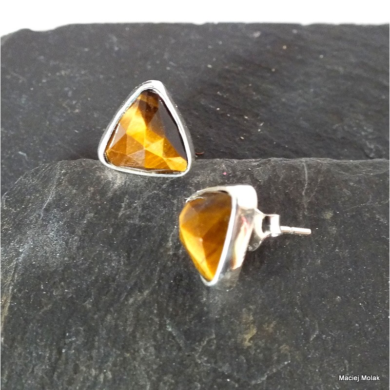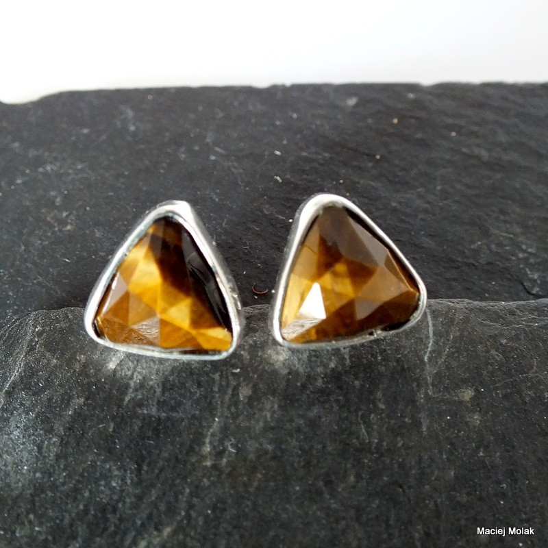 Nieduże kolczyki na sztyfcie z fasetowanym tygrysim okiem. Takie niezobowiązujące trójkąciki.