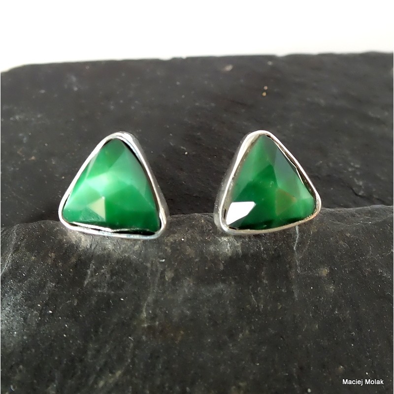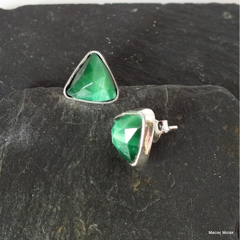 Nieduże kolczyki na sztyfcie z fasetowanym zielonym tygrysim okiem. Takie niezobowiązujące trójkąciki.