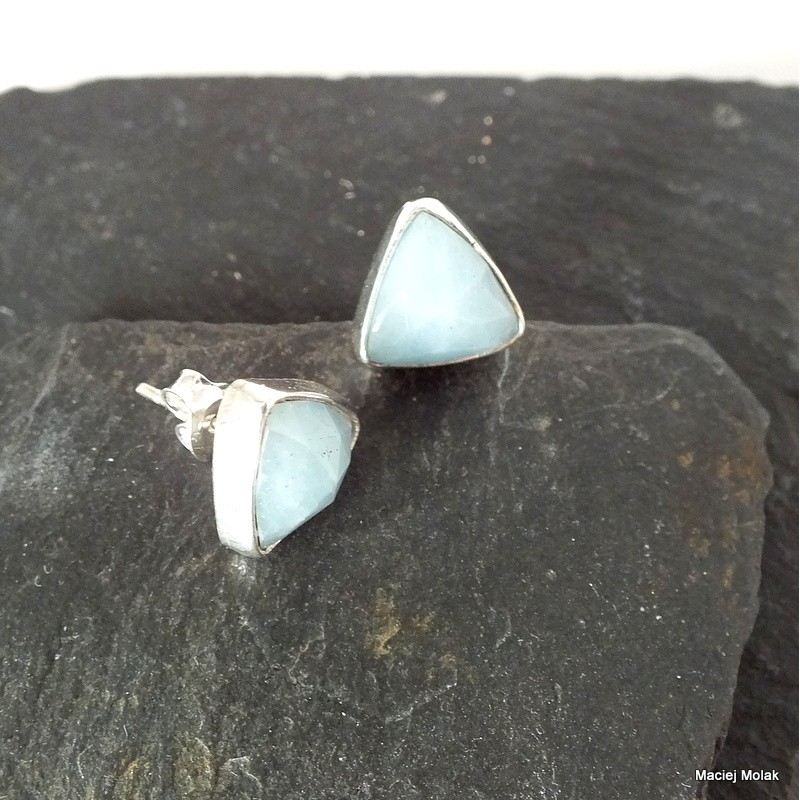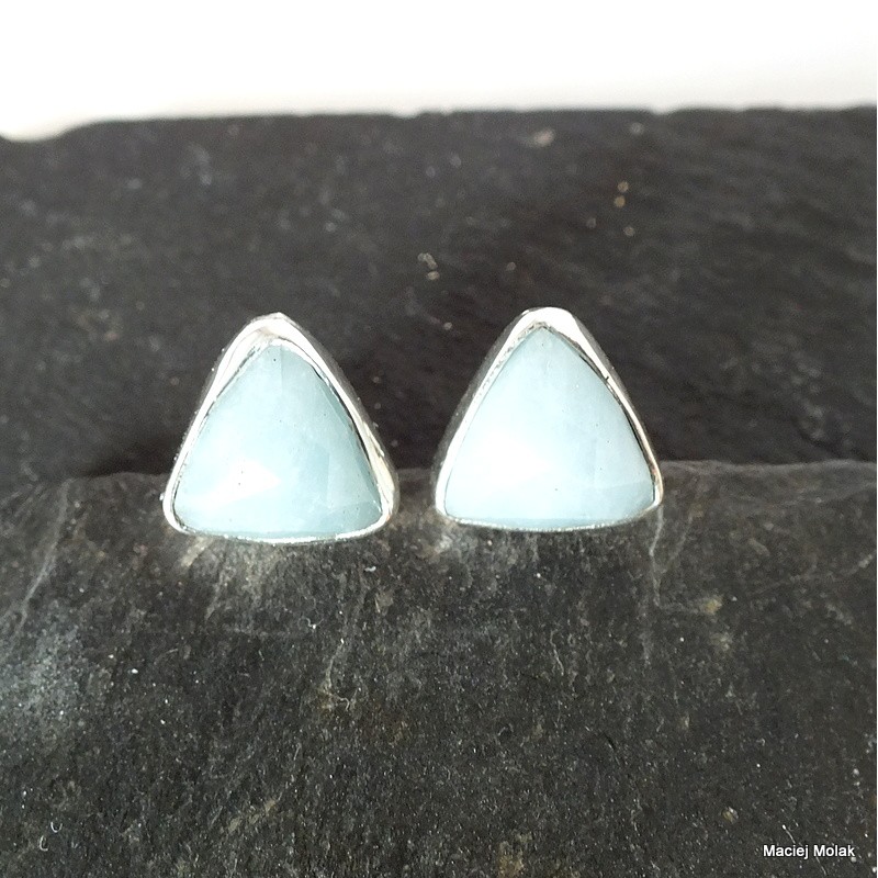 Nieduże kolczyki na sztyfcie z fasetowanym akwamarynem. Takie niezobowiązujące trójkąciki.