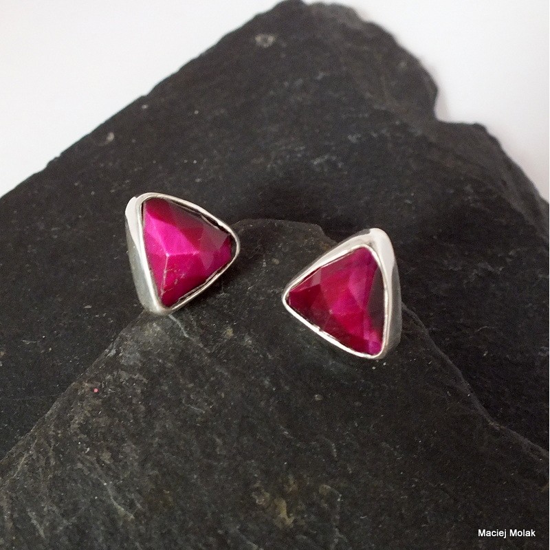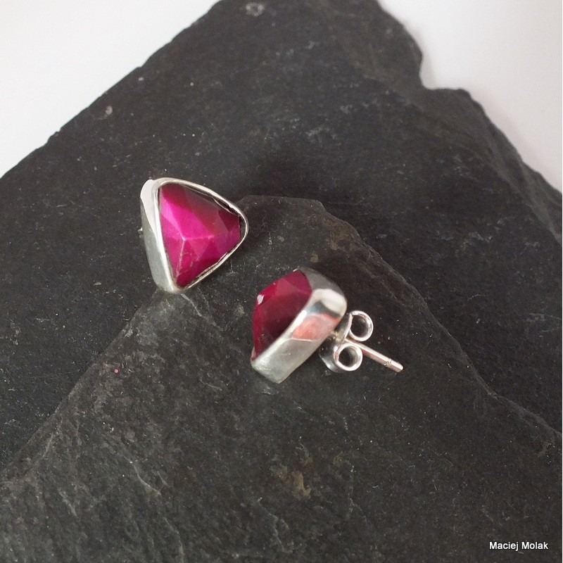 Nieduże kolczyki na sztyfcie z fasetowanym bordowym tygrysim okiem. Takie niezobowiązujące trójkąciki.