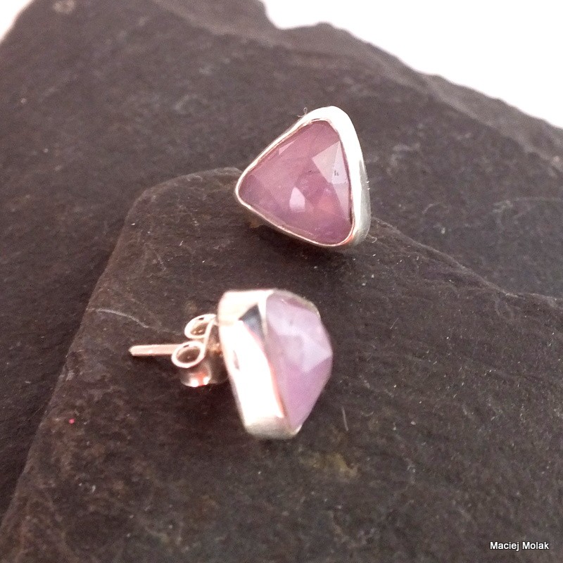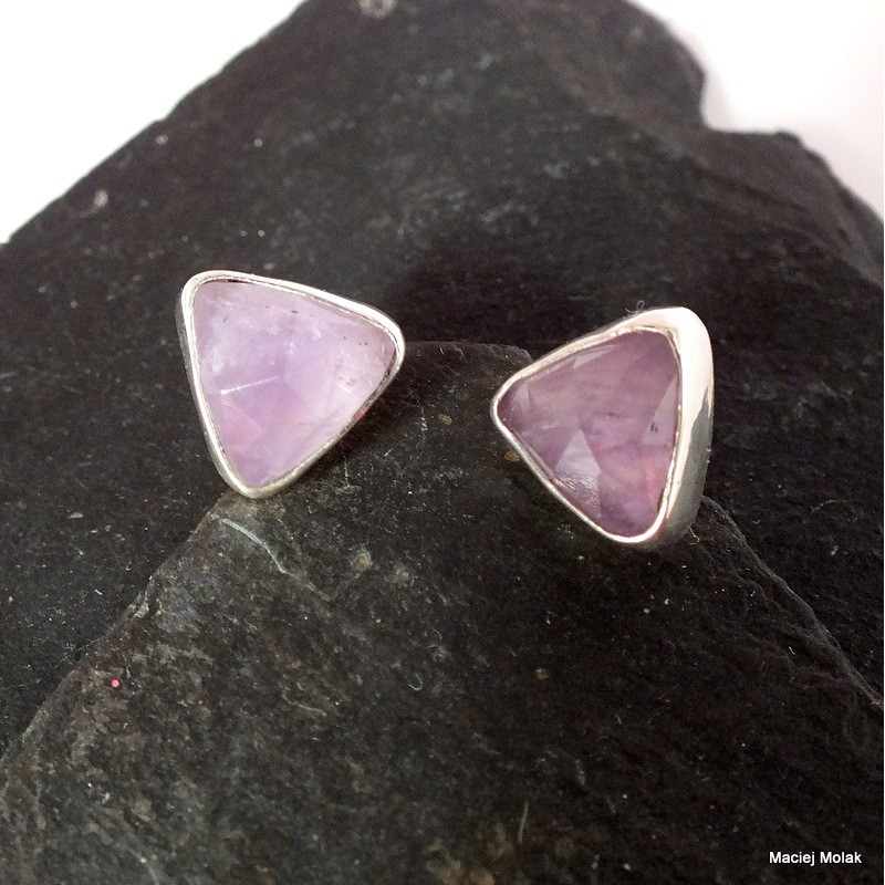 Nieduże kolczyki na sztyfcie z fasetowanym jasnofioletowym ametystem. Takie niezobowiązujące trójkąciki.