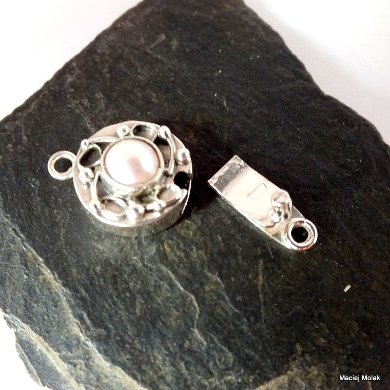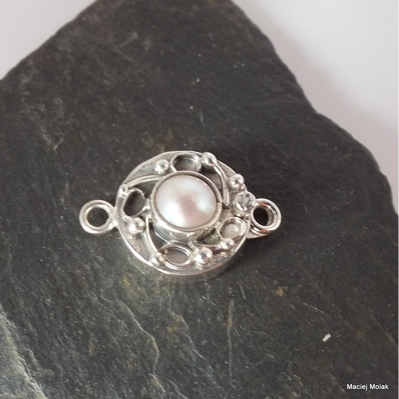 Srebrne,ręcznie robione zapięcie do pojedynczego sznura pereł (mozna podwiesić więcej drobniejszych). Może to być naszyjnik lub bransoleta.