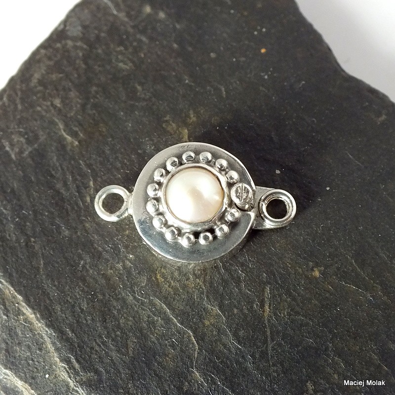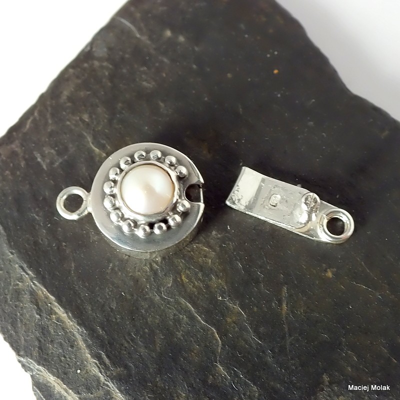 Srebrne,ręcznie robione zapięcie do pojedynczego sznura pereł (można podwiesić więcej drobnych sznurów). Może to być naszyjnik lub bransoleta.