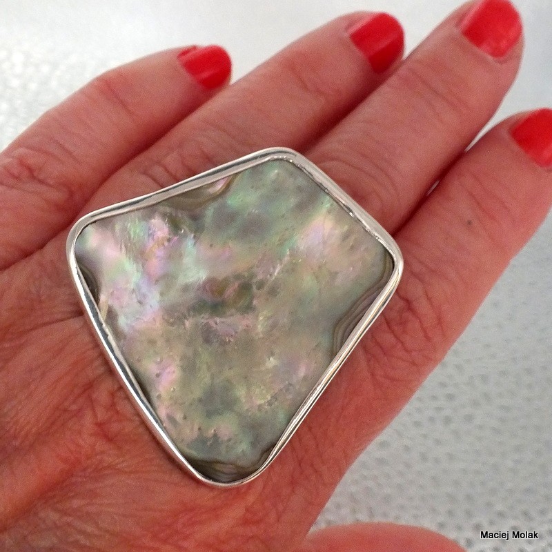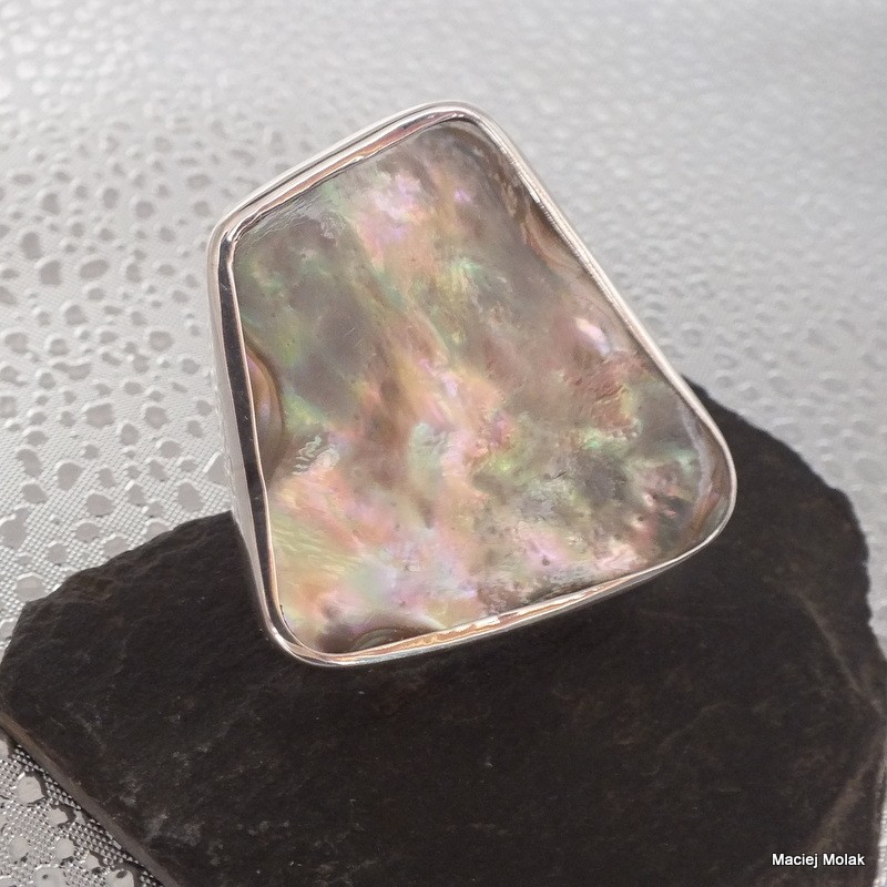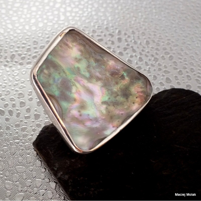 Pierścionek z masą perłową opalizującą na zielono, niebiesko i różowo.